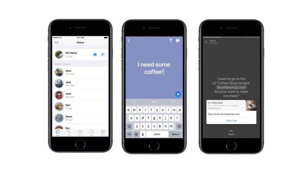 从官方释出的示範图片可看出,就如同 Facebook 针对内建相机的更新,WhatsApp 在限时动态中,一样可输入想要的文字,并搭配喜欢的背景颜色做搭配;另外,在好友的限时动态中,也多了项快速回覆按键,以及可选让谁可看自己的限时动态,或是检视谁看了你的动态等隐私设定。
